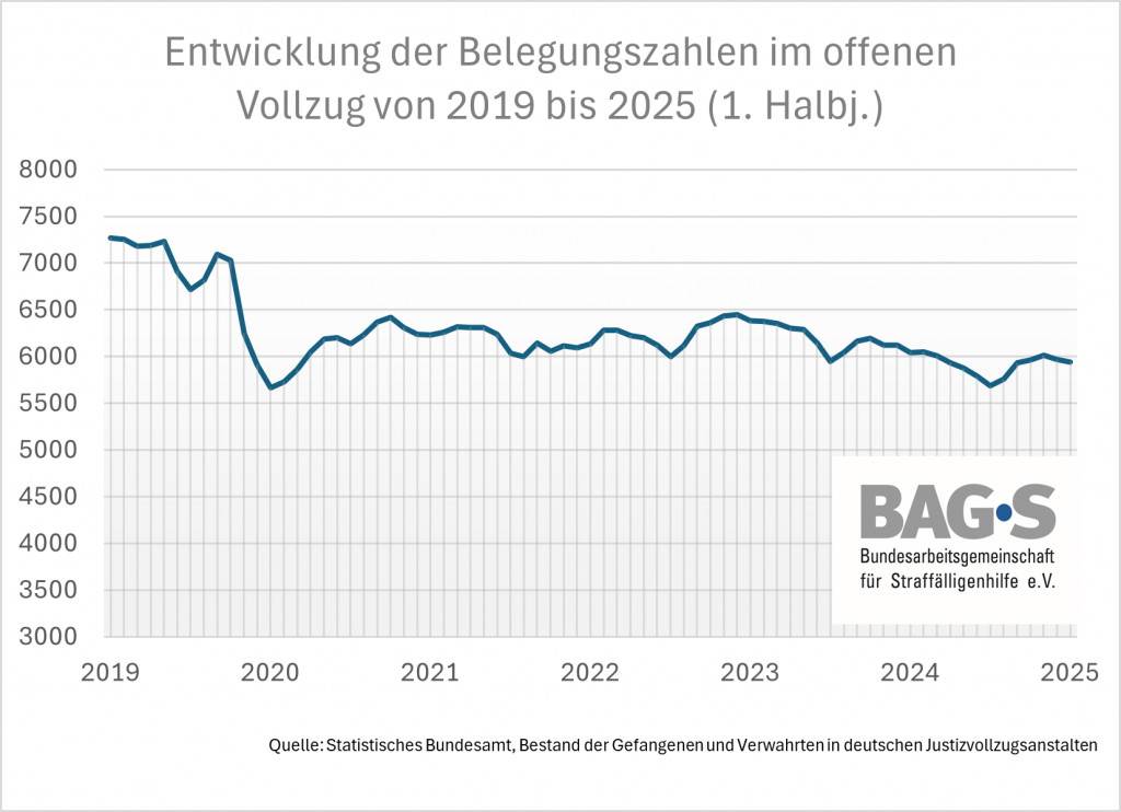 Eine gegenläufige Entwicklung ist dagegen im offenen Vollzug festzustellen. Im Vergleich zu 2019 waren im ersten Halbjahr 2025 17 % weniger Personen im offenen Vollzug untergebracht (vgl. Grafik 3).