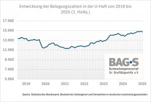 Insbesondere in der Untersuchungshaft steigen die Zahlen in der ersten Hälfte des Jahres 2025 weiter an und erreichen im Mai mit fast 15.000 einen hohen Wert (vgl. Grafik 2).