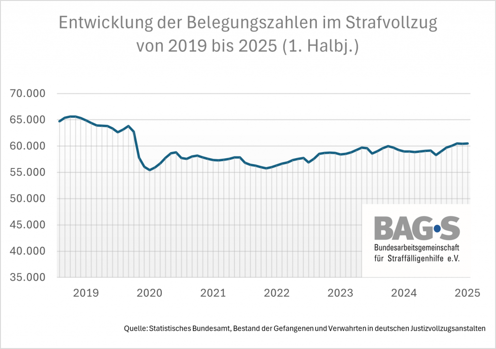 Das Statistische Bundesamt hat die Belegungszahlen für das erste Halbjahr 2025 veröffentlicht. Demnach ist eine weitere, wenn auch sehr leichte Steigerung der durchschnittlichen Belegung zu verzeichnen. Im ersten Halbjahr waren durchschnittlich 60.000 Menschen inhaftiert. Dies entspricht einem Anstieg von einem Prozent im Vergleich zum gleichen Zeitraum des Jahres 2024, liegt jedoch noch sieben Prozent unter der Belegung im Jahr 2019, also vor der Corona-Pandemie (vgl. Grafik 1).